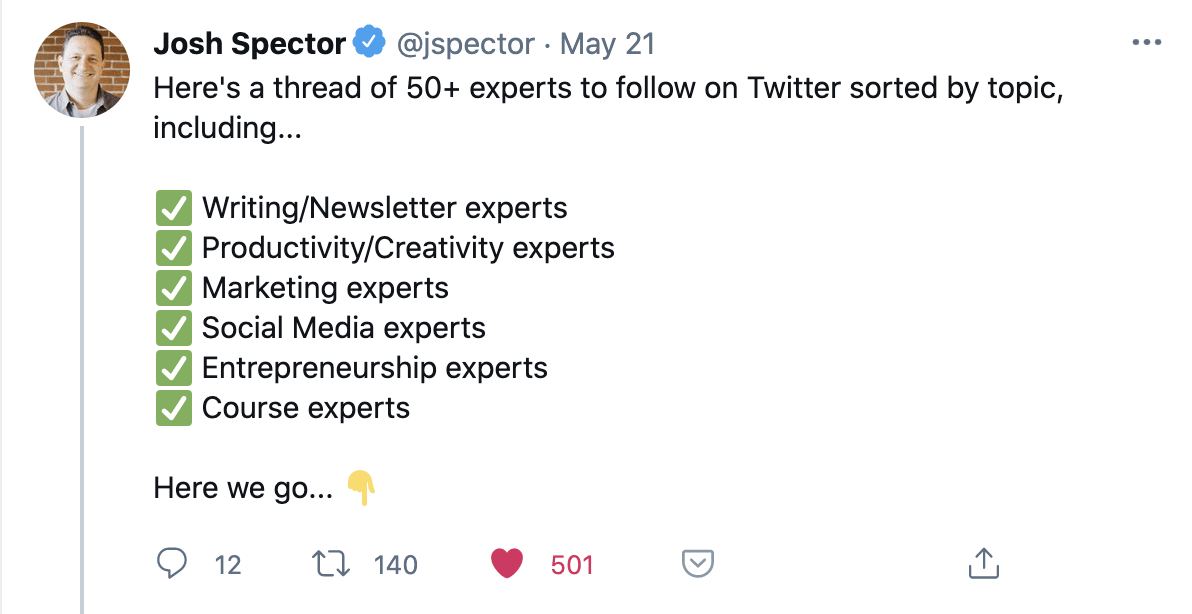 “Here’s a thread of 50+ experts to follow on Twitter, sorted by topic.”