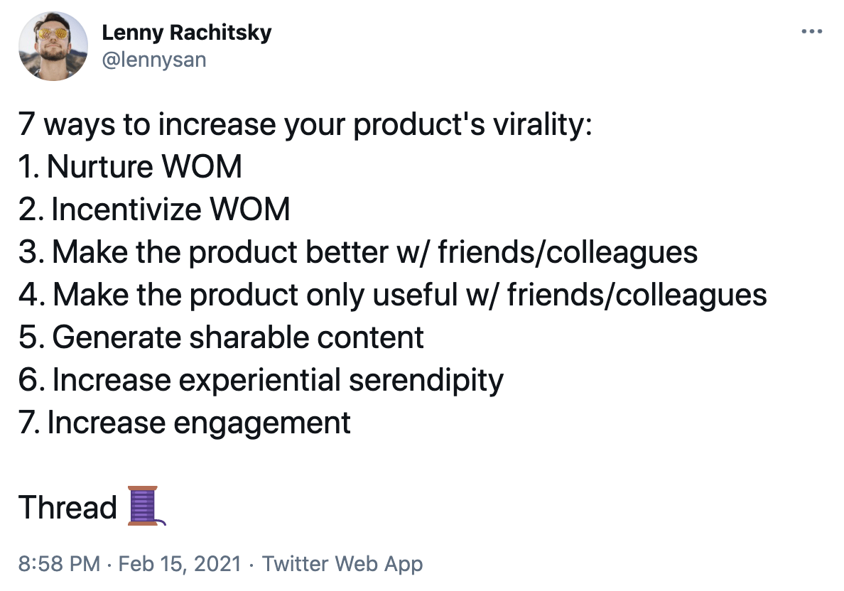 Lenny Rachitsky breaks down seven ways to increase your product’s virality including to nurture word-of-mouth, make the product better when more friends use it, and generate content users want to share.